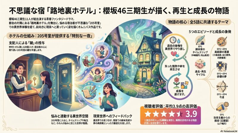 櫻坂46三期生が総出演する本作は、路地裏に佇む不思議なホテル“205号室”を舞台に、それぞれが過去や葛藤と向き合い成長していく青春ファンタジー。