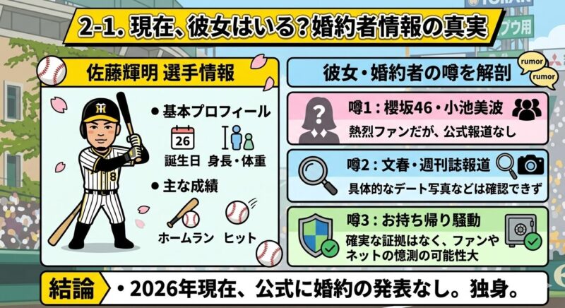 結論から申し上げますと、2026年現在、佐藤輝明選手が特定の女性と「婚約」しているという公式な発表はありません。
